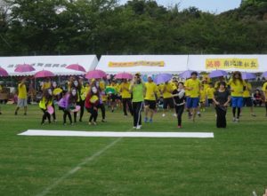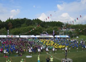 法吉小学校のグラウンドは「芝生化」されています。地域の人も管理に参加し、この日のために芝を仕上げました。参加者約1,000人が入場行進後、準備体操のためにグラウンドいっぱいに広がりました。