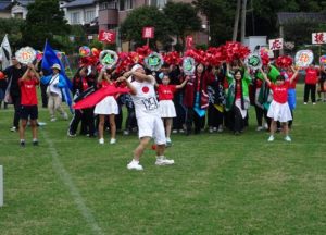 法吉地区ではお昼休みに地区対抗応援合戦が繰り広げられます。「応援態度・演技・ユニークさ・デコレーション」が採点項目で、審査員は各地区の自治会長。1か月前から各地区とも5回程度の練習を行い、競技とは別に表彰(賞状・トロフィー・賞金)があることから、応援席挙げて盛り上がります。詳細は法吉公民館ホームページ(外部サイト)をご覧ください。