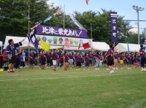 「比津町」  子ども会主体の応援団を率いるのは「女子大生と中学生」。デコレーションは親睦会と自治会体育部員が設営。子ども会による「小学生リレー」はブッチギリの1着で「3連覇!」。得点競技にシテヨ!。