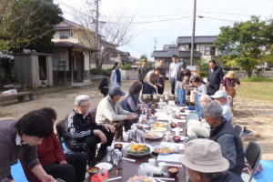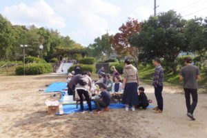 秋の柔らかい日射しの国尾公園にテーブルを広げての「なごやか会」。 3年ぶりに晴れの日に巡り合い、「子ども会・老人会・自治会」から35名も集まり、和やかな情報交換会ができました。