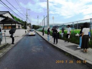 関係の自治会が多いことから、川津地区自治連合会が関わり課題を整理、平成30年11月、市に要望書を提出。今年度から島根大学の学生も加わってのワークショップ、その後川津小学校のPTAや松江市の職員にも参加してもらい、道路環境の課題解決に向けてみんなで論議しています。