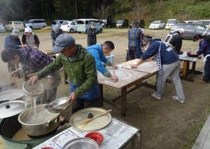 「コネ」「延ばし」「切り」「湯がき」の流れ作業です。本日は14Kgのソバを打ちました