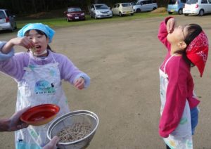 切って湯がいた後、「試食」で「アーン」。二人そろって「美味しーい!」