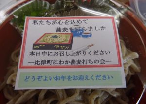 比津町では12月29日に、80歳以上の高齢者・65歳以上の独居世帯・地域でお世話になっている人に手打ちソバを届けています。この日は親睦会・自治会役員・福祉推進員・子ども会の44人が、90人にソバを届けました。この活動は今年で18回目で、地域の恒例行事となっています。